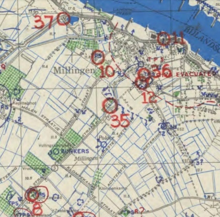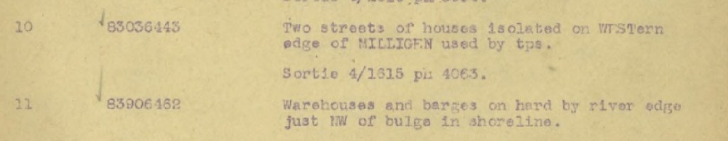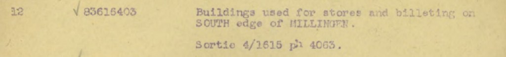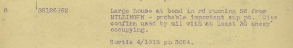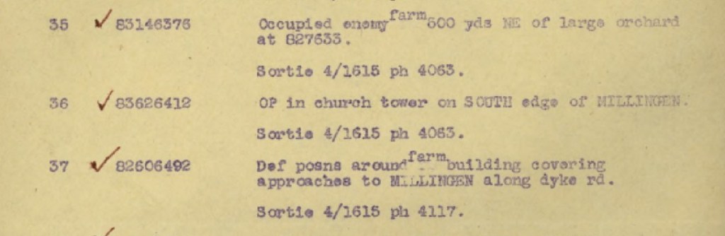 Am 3. Februar 1945 führte die RAF Aufklärungsflüge über das Frontgebiet, darunter Millingen, durch. Während der Vorerkundung machten sie verschiedene Luftaufnahmen von Millingen. Die Luftaufnahmen wurden verwendet, um ihre Ziele auf einer Karte zu markieren. Die Kartenkoordinaten der Ziele wurden bis auf 10 Meter genau angegeben. Im gesamten Gebiet hatten sie Dutzende Ziele markiert. Rund um und in Millingen selbst gab es 7 Ziele.
