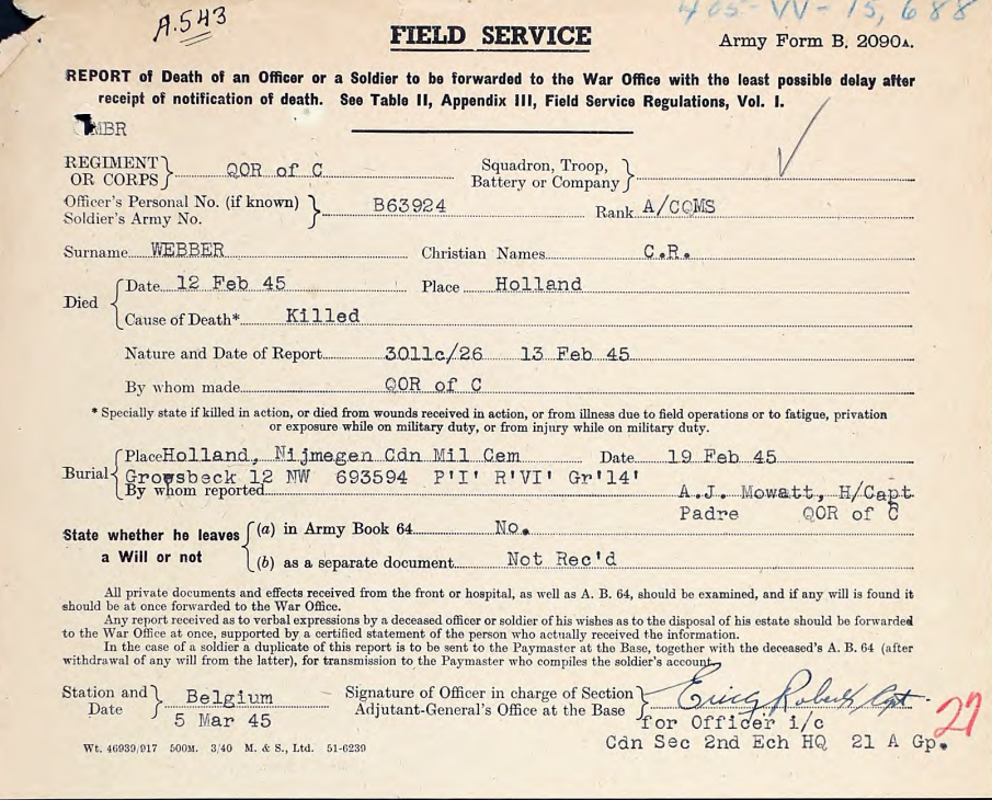 Am 12. Februar um 06:00 Uhr installierten die Royal Canadian Engineers Rauchkörper auf dem Deich, damit der Feind schwerer sehen konnte, was sich auf dieser Seite des Flusses abspielte. Die Versorgung kam regelmäßig mit Dukws an. An diesem Tag fielen auch 2 Sergeanten: Compagnies Quartermaster Sergeant Charles Robert Webber und Sergeant Harold Payne. Sergeant Webber war Quartiermeister in der Intendanz und damit an Verlegungen beteiligt. Der genaue Ort, an dem Webber fiel, ist nicht bekannt; da er Quartiermeister war, ist es möglich, dass er außerhalb von Millingen gefallen ist. Sergeant Payne sollte einen Platz vorbereiten, an dem die Dukws ihre Vorräte entladen konnten. Durch das Hochwasser war das schwieriger. Am 16. Februar schrieb Kommandant S.M. Lett einen Brief an die Freundin von Payne. Kommandant Lett war deutlich über die Todesursache: Payne fiel in Millingen durch einen deutschen Granatsplitter. Die Leichname wurden mit denselben Dukws abtransportiert, mit denen auch die Vorräte gebracht wurden. Sie wurden auf dem provisorischen kanadischen Friedhof in Jonkerbos beigesetzt.