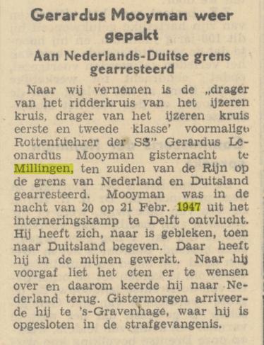 Gerard Mooyman geriet am 4. Mai 1945 in amerikanische Kriegsgefangenschaft. Einige Tage später gelang ihm die Flucht, und er tauchte in Deutschland unter. Im März 1946 wurde er in den Niederlanden verhaftet. Während eines Transports von Scheveningen nach Delft gelang Gerard Mooyman erneut die Flucht. Er floh daraufhin wieder nach Deutschland. Dort arbeitete er im Bergbau. Die Verpflegung ließ zu wünschen übrig, weshalb er wieder in die Niederlande zurückkehrte. Gerard Mooyman wurde schließlich am 28. August 1947 an der niederländisch-deutschen Grenze bei Millingen aan de Rijn verhaftet. Im Oktober 1947 stand er vor Gericht, das ihn zu einer Haftstrafe von sechs Jahren verurteilte. Ende August 1949 wurde er vorzeitig entlassen. Nach seiner Entlassung führte Gerard Mooyman ein unauffälliges Leben in der Stadt Groningen. Er heiratete und bekam eine Tochter. 1987 kam er bei einem Verkehrsunfall in der Nähe von Anloo ums Leben.