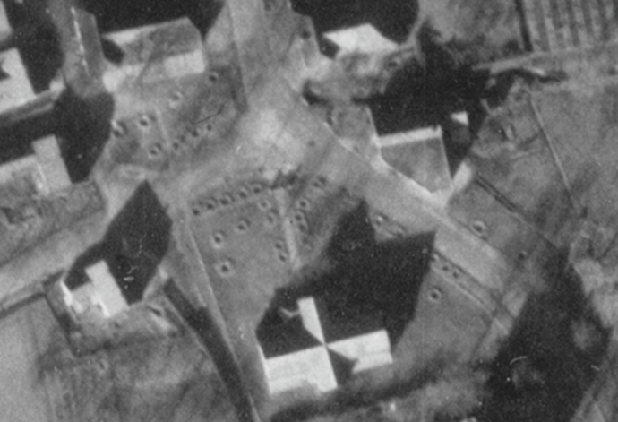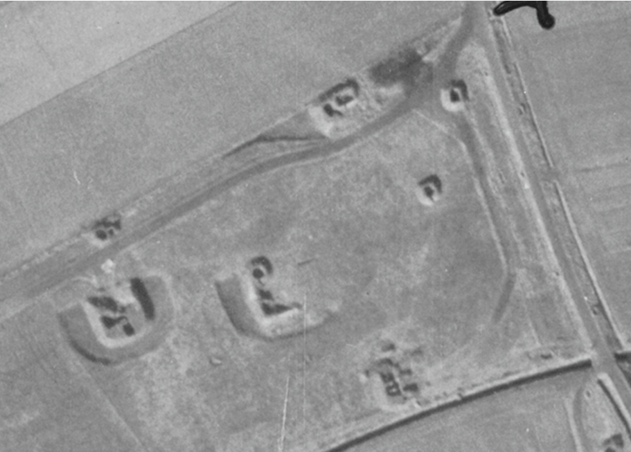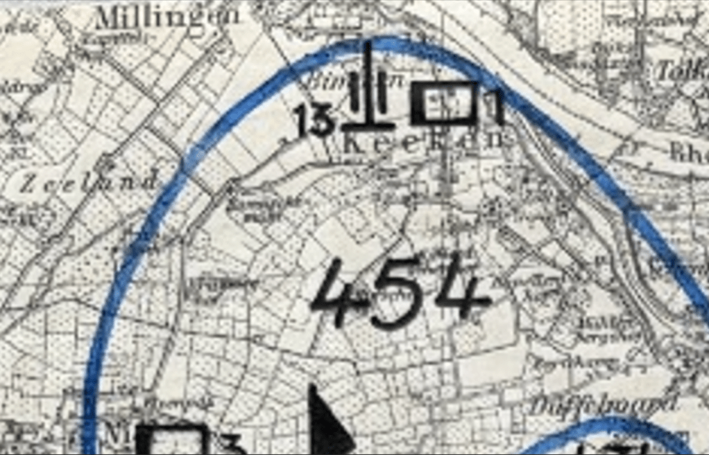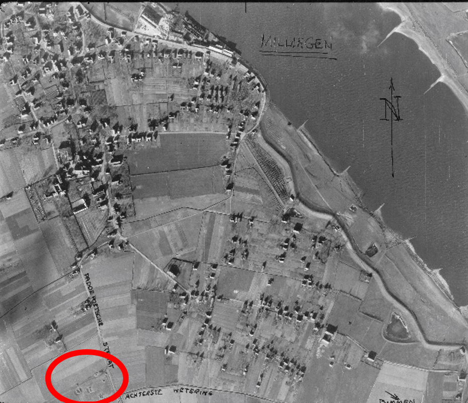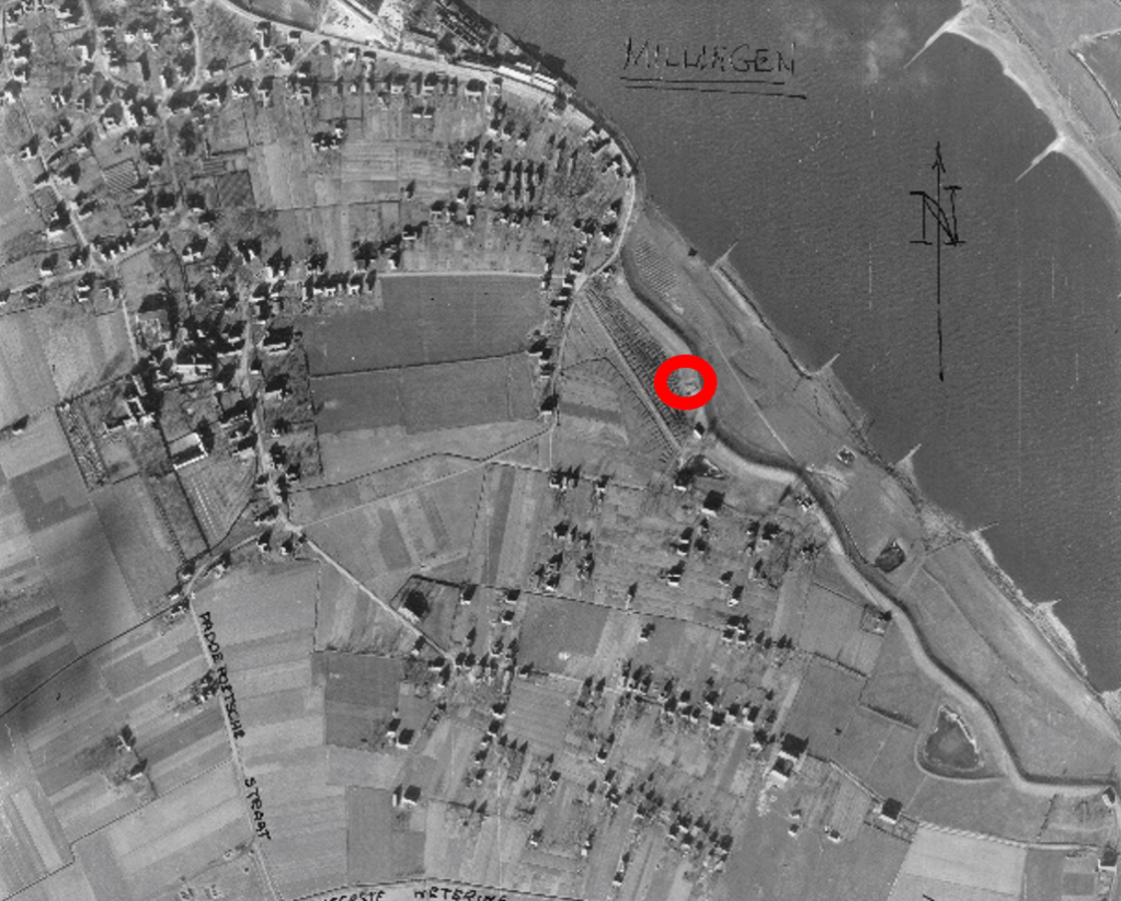 The Germans also constructed a shooting range in the dike in Millingen (approximately where the carnival association is now located). At the end of the range stood a target board, and behind it, someone with a pointing stick indicated whether the shot had hit. There were several drill grounds in Millingen, such as on Zeelandsestraat. The Germans practiced every week on the shooting range, marching from their quarters through Millingen to the range while singing military songs. They often sang: Wir fahren gegen England. It always drew a crowd when they marched. “About 20 of us local boys would march behind the German soldiers, singing along with them. The soldiers always gave us candy, and the best part was when we accompanied them to the range to watch them shoot. Early in the war, we already noticed the quality of the weapons and ammunition was declining, but of course for a shooting range, they wouldn’t use high-quality ones. When they finished shooting, we were allowed to pick up the shell casings, which we loved to do. Once a week, there was always a strict officer who chased us away.” In the aerial photo, you can see the shooting range.
