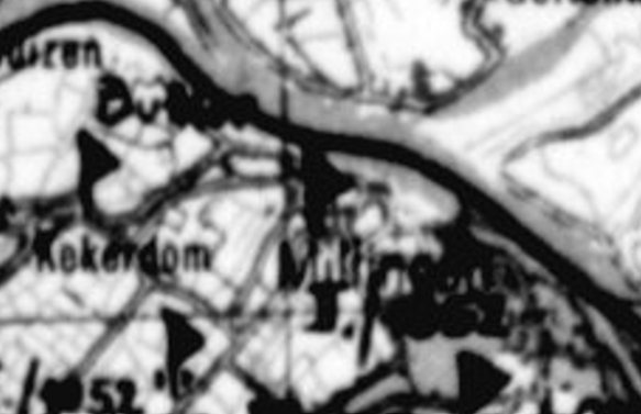 On 17 September 1944, Operation Market Garden began. Panic broke out among the German soldiers. Many fled back to Germany, passing through Millingen. They threw away their weapons and crossed the border at Bimmen. Some German soldiers were taken across the river by the Van Wijck ferry, throwing their weapons into the Rhine. Suddenly, there were no German soldiers left in Millingen, but this was short-lived. Soon, German military vehicles arrived from Germany. Soldiers disembarked and immediately began setting up machine guns. Many German vehicles with troops and artillery passed through Millingen. On 29 September, dozens of heavy vehicles drove through Millingen toward the front (Leuth/Erlecom). Soon, the Germans ordered the people of Millingen to dig at least one foxhole per household. “Millingen was being shelled by the Allies, and I saw a German soldier on a bicycle who didn’t know how to get into a foxhole. He cycled straight into the hole and ended up upside down with the bicycle on top of him. I said to my neighbour’s boy: shall we help him? The neighbour’s boy said: No, we’ll just leave him like that.” The Germans quickly set up artillery in Millingen on Zeelandsestraat and Zeelandsestraat/Spaldropweg and also billeted soldiers in houses.