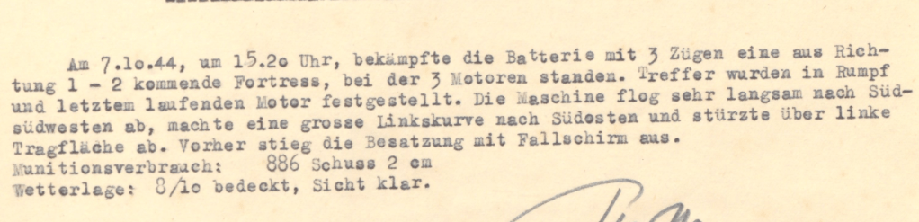 “I saw I. Zug 6-598 fire at a Fortress at 3:28 p.m. and hit it. The plane then made a turn to the left and crashed after several crew members had parachuted out. The shots were well aimed.”