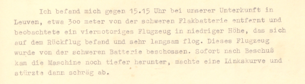 Ogfr. Hermann Kirst (Witness 1) later describes how he saw everything unfold from 300 meters away from an anti-aircraft battery: